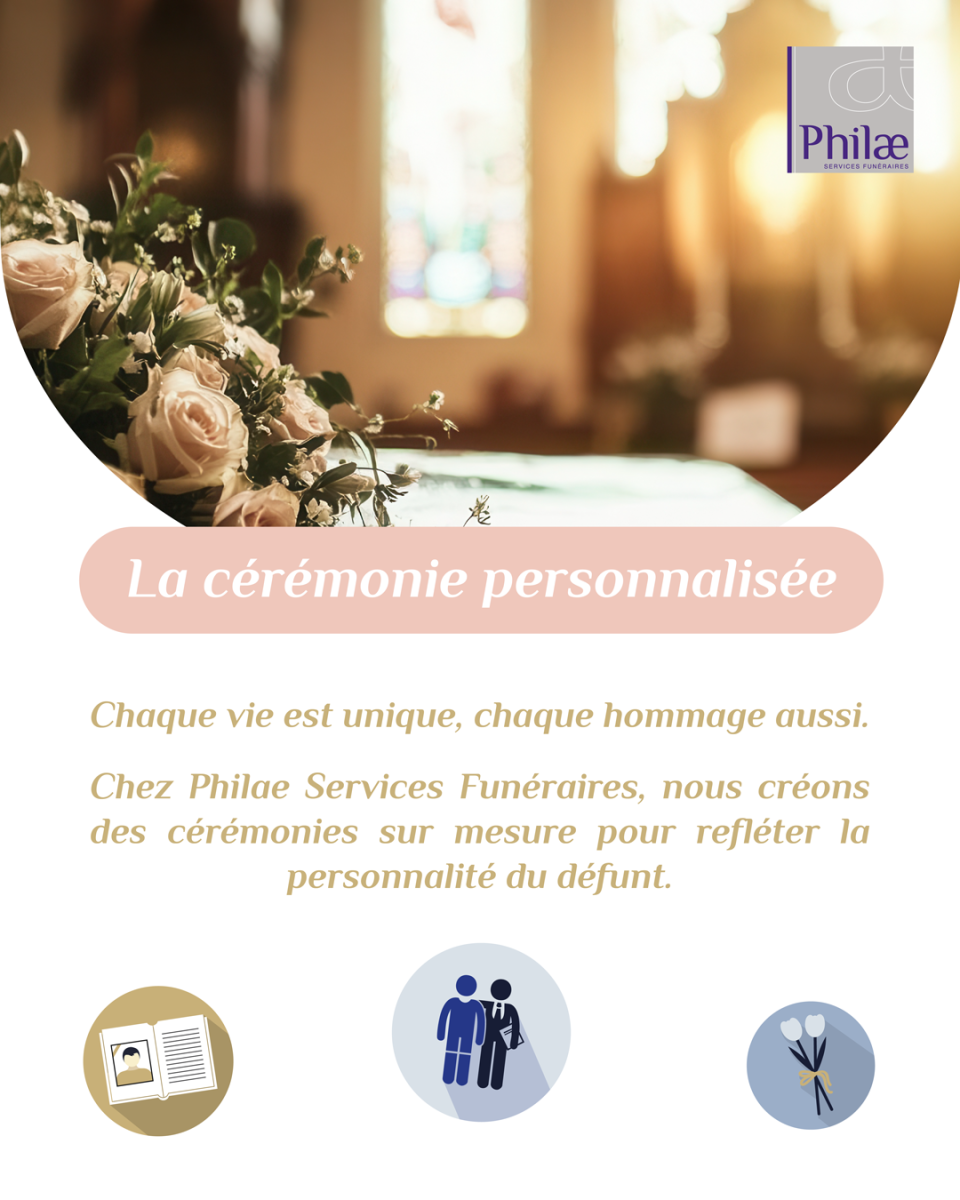 Chez PF Lopeso Philae, nous vous accompagnons pour créer une cérémonie personnalisée : choix des musiques, textes, décorations florales… tout est pensé pour rendre un dernier hommage respectueux et sur mesure.
